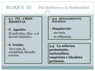 Este documento resume la transición filosófica entre la cosmovisión medieval y los problemas de la modernidad. Analiza las filosofías de Agustín, Tomás de Aquino, Maquiavelo y los racionalistas, empiristas e idealistas alemanes como Descartes, Hume y Kant. Explica las cinco vías de Tomás de Aquino para probar la existencia de Dios y cómo Maquiavelo separó la política de la moral. También resume las teorías del conocimiento de Descartes, Hume y Kant sobre las ideas innatas, impresiones, categorías y la revolución