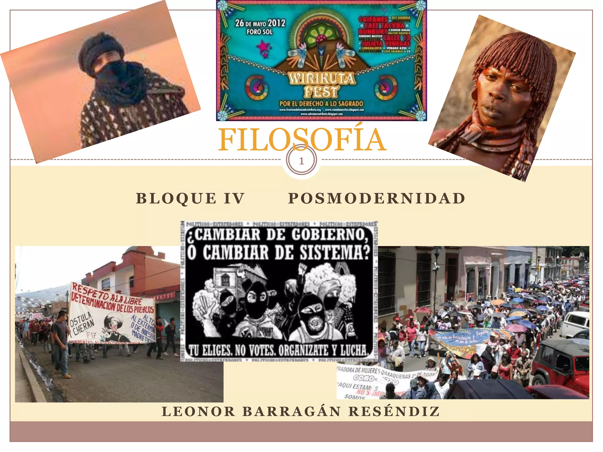 El documento presenta una introducción a la filosofía posmoderna. Brevemente describe la modernidad y cómo la posmodernidad surge como respuesta a las limitaciones de la modernidad. También presenta algunos de los pensadores clave de la posmodernidad como Nietzsche, Heidegger y Vattimo, así como conceptos como el pensamiento débil.