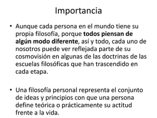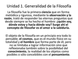 El documento trata sobre la filosofía, su origen, objetivos y métodos. Explica que la filosofía surgió para responder preguntas fundamentales sobre el ser humano y el mundo mediante la observación y la razón. Describe los principales métodos filosóficos como el socrático, aristotélico y cartesiano, y explica que la filosofía incluye disciplinas como la lógica, ética y epistemología. Finalmente, distingue entre ciencias formales e empíricas, e introduce conceptos como el método cient
