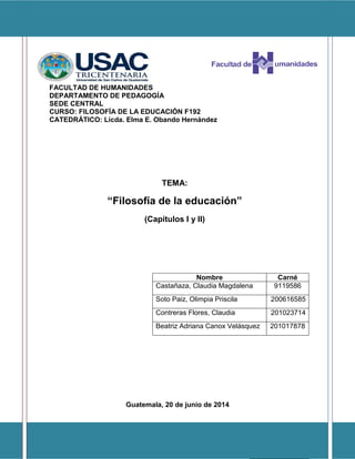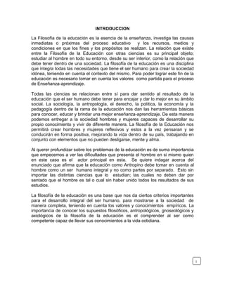 Este documento presenta una introducción a la filosofía de la educación. Explica las relaciones entre esta disciplina y otras ciencias como la sociología, antropología y pedagogía. Incluye el capítulo 1 que define la filosofía de la educación, clasifica sus ramas y describe sus tareas. Finalmente, analiza la relación entre la filosofía de la educación y la teoría de la educación.