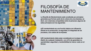 El documento presenta diferentes filosofías y tipos de mantenimiento. Explica que la filosofía de mantenimiento incluye principios como que el mantenimiento es fundamental para la producción y seguridad. También describe los objetivos del mantenimiento y los tipos de mantenimiento correctivo, preventivo, predictivo, productivo total y basados en confiabilidad, riesgo y gestión de activos. Concluye que una buena inversión en mantenimiento trae ganancias a largo plazo por mejoras en producción y seguridad.