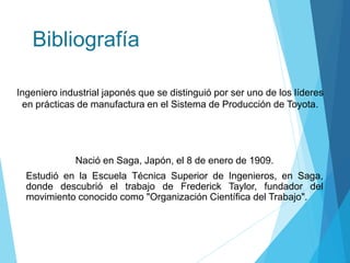 Shigeo Shingo fue un ingeniero industrial japonés que desarrolló varias técnicas de manufactura como el Sistema Just in Time y el Cambio Rápido de Instrumento. Nació en 1909 en Japón y estudió en la Escuela Técnica Superior de Ingenieros donde descubrió el trabajo de Frederick Taylor. A lo largo de su carrera introdujo mejoras en los procesos de ensamblaje y calidad que llevaron a cero defectos en las líneas de producción.
