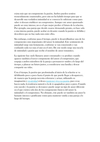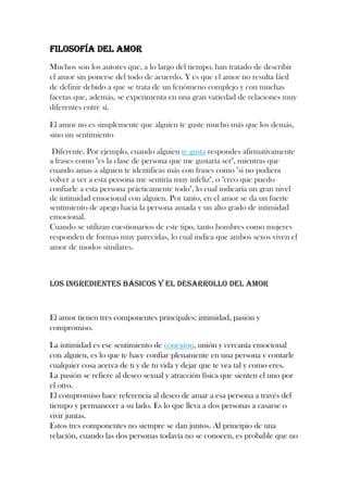 El documento describe la filosofía del amor, explicando que es un fenómeno complejo con muchas facetas que se experimenta de diferentes maneras. Define el amor como un fuerte sentimiento de apego e intimidad emocional hacia otra persona, más allá de la atracción física. Explica que el amor se compone de tres ingredientes principales - intimidad, pasión y compromiso - que se desarrollan a lo largo del tiempo en una relación, pasando de la pasión inicial a la intimidad y compromiso duraderos.