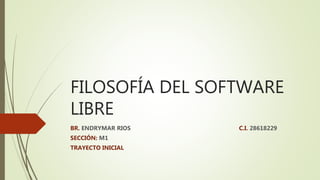 El documento habla sobre la filosofía del software libre. Explica que Richard Stallman fundó el movimiento de software libre y define cuatro libertades fundamentales del software libre. También menciona el decreto presidencial y la ley de Infogobierno de Venezuela que promueven el uso de software libre en el gobierno. Resalta los esfuerzos del gobierno venezolano para capacitar a la población y migrar sistemas gubernamentales al software libre a través de iniciativas como Canaima y la Misión Ciencia.