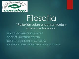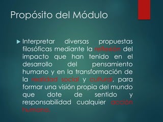 Este documento presenta el módulo de filosofía para estudiantes del CONALEP Tlaquepaque. El módulo busca que los estudiantes reflexionen sobre propuestas filosóficas y su impacto en el pensamiento humano y la sociedad para formar su propia visión del mundo. El módulo se divide en cuatro unidades que cubren los orígenes de la filosofía, las filosofías antigua y medieval, las corrientes modernas y posmodernas, y la estética. El objetivo final es que los estudiantes desar