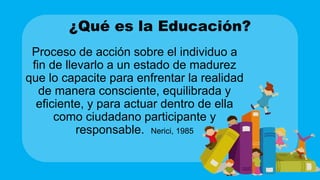 La educación es un proceso de formación del individuo para enfrentar la realidad de manera consciente y responsable. Existen tres tipos de educación: formal, no formal e informal. La filosofía y la educación están estrechamente relacionadas y comparten el objetivo de formar personas con valores morales y conocimiento. Las tres grandes escuelas filosóficas de la educación son el idealismo, el realismo y el pragmatismo, las cuales difieren en su enfoque sobre la naturaleza de la realidad y el conocimiento.