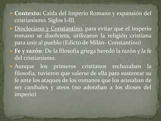 1) El documento describe el contexto histórico de la caída del Imperio Romano y la expansión del cristianismo entre los siglos I y III. 2) Diocleciano y Constantino utilizaron la religión cristiana para unir al pueblo y evitar la disolución del imperio. 3) Los primeros cristianos heredaron la razón de la filosofía griega y la fe del cristianismo.