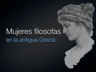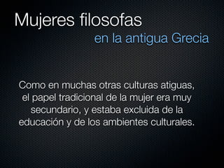 En la antigua Grecia, aunque tradicionalmente las mujeres tenían un papel secundario y estaban excluidas de la educación, algunas mujeres destacaron como filósofas a pesar de las limitaciones. Algunas de las más importantes fueron Teano, esposa de Pitágoras y perpetuadora de su legado; Hiparquia, esposa del filósofo cínico Crates; y Aspasia y Hipatia, reconocidas maestras y pensadoras.
