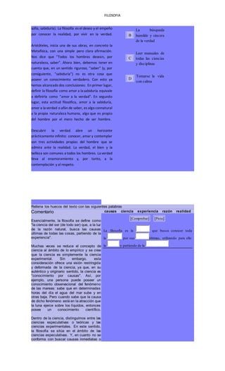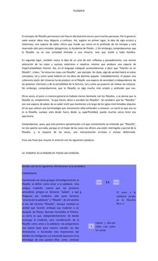 El documento examina las ideas erróneas y confusas que la gente tiene comúnmente sobre la filosofía. Se describe a la filosofía como algo más que un saber místico o un arte de vivir serenamente, sino como una actividad que atañe a todo hombre y que busca conocer la realidad a través de la razón.