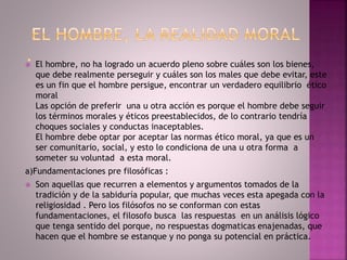El documento discute varios temas relacionados con la ética incluyendo las diferentes fundamentaciones de la ética, la importancia de la sexualidad y el amor, y la naturaleza individual y social de la ética. Se mencionan conceptos como el escepticismo moral, las fundamentaciones metafísicas, aristotélicas y kantianas de la ética, y la necesidad de analizar la ética desde un enfoque histórico e interrelacionado con la sociedad.