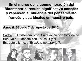 La charla-taller presentará información sobre el pensamiento existencialista de Jean-Paul Sartre y su relación con Simone de Beauvoir. También abordará el debate entre Sartre y Michel Foucault sobre el estructuralismo y la muerte del sujeto. La charla estará a cargo de la profesora Carla Maciel de la Universidad de Buenos Aires y contará con la colaboración de Juan Manuel Piñeiro, alumno destacado de filosofía. Se llevará a cabo el 7 de agosto de 2010 en la Biblioteca Municipal Dr. Octavio