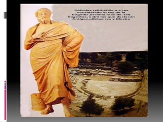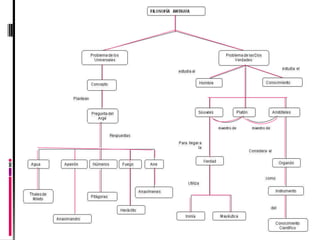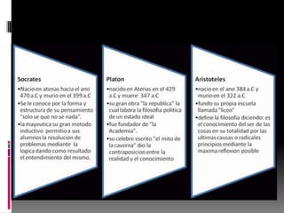 El documento trata sobre la filosofía griega y romana. Resume que la filosofía romana se vuelve más práctica y orientada a la acción, y valora el consenso. Explica que la filosofía griega abarca desde los presocráticos hasta la filosofía helenística, mencionando a algunos filósofos griegos importantes como Sócrates, Platón y Aristóteles.