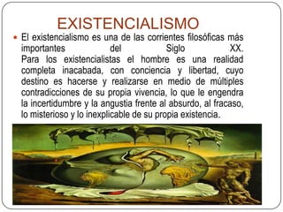 Este documento resume las ideas principales del existencialismo y presenta a sus representantes más importantes como Martin Heidegger, Jean-Paul Sartre y Albert Camus. Explica que para los existencialistas, el ser humano es una realidad inacabada definida por su libertad y conciencia que se enfrenta a la angustia y el absurdo. También describe las visiones de cada filósofo sobre temas como el ser, la existencia humana y la condición mortal del hombre.