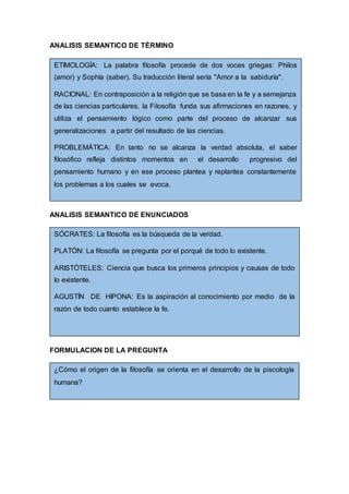 El documento presenta información sobre el origen y desarrollo de la filosofía. Explica que la filosofía surge de la búsqueda de la sabiduría y del deseo de comprender la realidad, superando las explicaciones míticas. También menciona que la filosofía se basa en el análisis crítico y en el protagonismo de la razón.