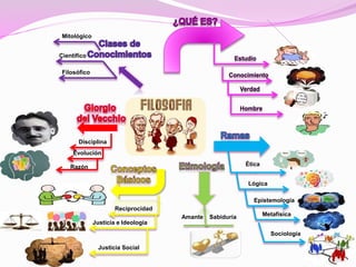 Este documento presenta una lista de términos relacionados con el estudio del conocimiento humano y la búsqueda de la verdad a través de la filosofía, la ciencia, las matemáticas y la lógica. Incluye conceptos como epistemología, metafísica, sociología, razón, ciencia, filosofía, matemáticas, inducción, hipótesis, cambio y escepticismo que han sido importantes a lo largo de la historia en la comprensión del origen y naturaleza de las cosas.