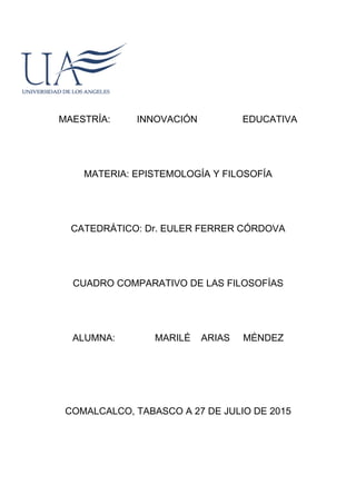 Este documento presenta un cuadro comparativo de las principales filosofías a lo largo de la historia. Describe brevemente la filosofía de la época antigua, medieval, antropológica y del renacimiento, mencionando a los autores más representativos de cada período y sus características. Finalmente, analiza las corrientes filosóficas de la modernidad como el racionalismo, empirismo e idealismo, señalando que este periodo representa el renacer de la filosofía griega influenciada por la religión cr
