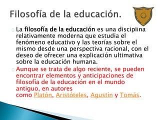 La filosofía de la educación es una disciplina moderna que estudia el fenómeno educativo y las teorías sobre el mismo desde una perspectiva racional, con el deseo de ofrecer una explicación ultimativa sobre la educación humana. Aunque se originó recientemente, existen elementos anticipatorios en autores antiguos como Platón y Aristóteles. Se relaciona con disciplinas como la pedagogía, la psicología y la sociología.