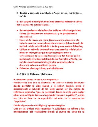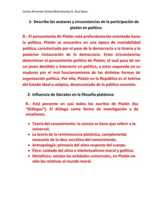 El documento resume las principales ideas de Platón sobre su participación en política, la influencia de Sócrates en su filosofía, su crítica al movimiento sofista, su teoría de las ideas y otros conceptos clave. Platón se vio influenciado por la inestabilidad política de su época y desarrolló una visión ideal de la política. Sócrates tuvo una gran influencia en su método filosófico y teorías del conocimiento y la ética. Platón criticó a los sofistas por enseñar por dinero y relativizar el conocimiento. Su