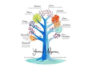 El documento presenta una introducción al yoga clásico de Patanjali, describiendo sus ocho aspectos principales: yamas, niyamas, asanas, pranayama, pratyahara, dharana, dhyana y samadhi. Luego explica cada uno de estos aspectos con más detalle, incluyendo las cinco abstinencias morales (yamas), las cinco observancias (niyamas), diferentes técnicas de respiración (pranayama) y los beneficios de la meditación.