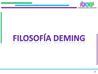 Este documento resume los principales puntos de la filosofía de mejora continua de W. Edwards Deming. Deming introdujo sus catorce puntos y su ciclo de mejora continua en Japón después de la Segunda Guerra Mundial, lo que ayudó a revitalizar la economía japonesa. El documento también describe las "enfermedades mortales" que obstaculizan la mejora de la calidad y algunos de los principios clave de Deming como eliminar la dependencia de la inspección masiva y adoptar un enfoque de liderazgo bas