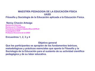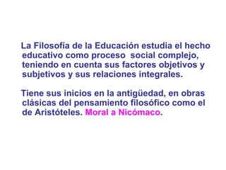 Este documento presenta una introducción a la Filosofía y Sociología de la Educación aplicada a la Educación Física. El objetivo general es que los participantes se apropien de los fundamentos teóricos, metodológicos y prácticos que aportan estas disciplinas para sustentar su labor educativa. Se explica brevemente el origen de la Filosofía de la Educación, sus intereses como el estudio del ser humano y el ideal de ciudadano, y sus funciones como la antropológica y axiológica. También