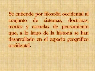 La filosofía occidental es un conjunto de sistemas y pensamientos desarrollados en el espacio geográfico occidental, comenzando con la escuela jónica que introdujo la explicación científica de la naturaleza. A lo largo de la historia, se destacan filósofos como Sócrates, Platón y Aristóteles, quienes sentaron las bases del conocimiento ético y científico, seguido por corrientes como el epicureísmo, estoicismo, escepticismo y neoplatonismo. Estos pensadores exploraron diversas preguntas sobre la existencia, la ética y la naturaleza del universo, influyendo profundamente en el desarrollo del pensamiento occidental.