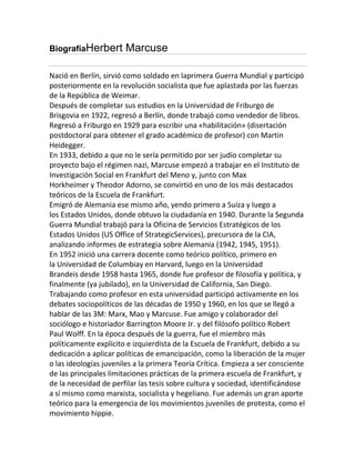 Herbert Marcuse nació en Berlín y sirvió en la Primera Guerra Mundial. Emigró de Alemania en 1933 debido al régimen nazi y se convirtió en uno de los principales teóricos de la Escuela de Frankfurt. Marcuse emigró a los Estados Unidos donde obtuvo la ciudadanía y trabajó analizando informes de estrategia sobre Alemania para la Oficina de Servicios Estratégicos. Más tarde tuvo una destacada carrera académica en varias universidades estadounidenses y participó activamente en