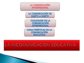 El documento habla sobre la comunicación educativa y los problemas que puede causar el aislamiento entre profesores y alumnos. Kierkegaard, un teólogo danés del siglo XIX, expresó que algunos profesores se aíslan en un mundo abstracto que les causa profunda soledad. También dijo que los conceptos solo son educativos cuando se enseñan en el contexto de situaciones concretas y cuando el profesor conoce el plano afectivo de los estudiantes.