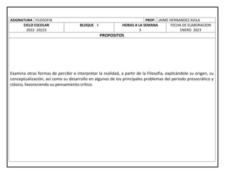 Este documento presenta el plan de estudios para la asignatura de Filosofía en el ciclo escolar 2022-2023. El curso se dividirá en cuatro bloques para examinar la filosofía desde sus orígenes hasta las corrientes contemporáneas. Los estudiantes aprenderán sobre el pensamiento prefilosófico, las principales escuelas de la antigüedad, el humanismo renacentista y las corrientes modernas y su tratamiento del conocimiento humano. La evaluación y entrega de trabajos se determinarán según el contexto de cada