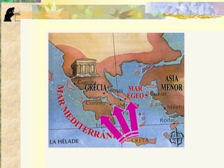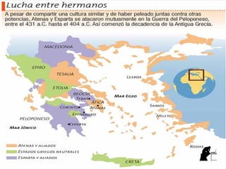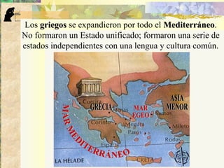 Los griegos se expandieron por el Mediterráneo y formaron estados independientes con una lengua y cultura común. Las ciudades-estado o polis como Esparta y Atenas eran el centro de la vida política, religiosa y militar. Atenas estableció la primera democracia mientras que Esparta tenía una sociedad militarista. Esto llevó a una guerra entre las dos que terminó con la decadencia de Grecia.