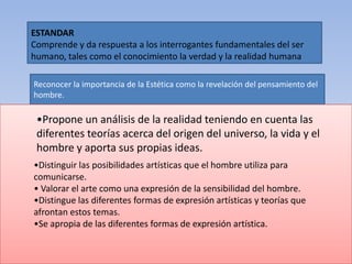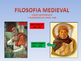 Este documento presenta un resumen de la filosofía medieval y del Renacimiento, así como del arte como expresión del pensamiento humano. Describe las ideas y características principales de filósofos como San Agustín, Santo Tomás de Aquino, Guillermo de Ockham, Nicolás Maquiavelo y Tomás Moro, así como de movimientos como el Renacimiento y la utopía. También aborda conceptos como la estética, la antropología y la política.