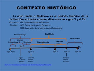 Este documento resume el contexto histórico y filosófico de la disputa entre la fe y la razón durante la Edad Media. La Edad Media se divide en Alta y Baja Edad Media, dominada por el cristianismo. Los padres de la iglesia establecieron el dogma cristiano basado en la interpretación bíblica. Más tarde, la escolástica intentó utilizar la razón aristotélica para comprender la revelación, dando lugar a un debate sobre la relación entre fe y razón. Figuras clave como Santo Tomás de Aquino