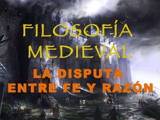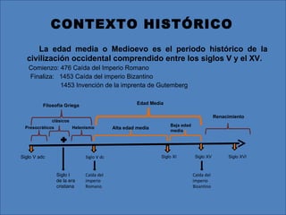 El documento describe el contexto histórico y filosófico de la Edad Media, incluida la disputa entre la fe y la razón. Explica los movimientos de la patrística y la escolástica, que intentaron reconciliar la filosofía griega y el pensamiento cristiano. También menciona algunos filósofos y obras importantes de este período como Agustín de Hipona, Tomás de Aquino y sus escritos.