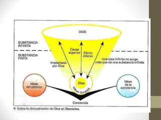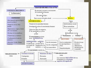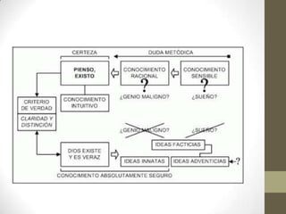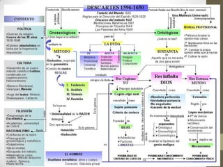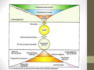 Este documento presenta un resumen de las corrientes filosóficas del racionalismo y el empirismo. El racionalismo, representado por Descartes, sostiene que es posible conocer la realidad a partir de principios puros del pensamiento y el método deductivo. Descartes establece tres verdades fundamentales: el yo existe, Dios existe, el mundo material existe. El empirismo, representado por Locke, Berkeley y Hume, sostiene que la experiencia sensorial es la base del conocimiento y que solo los objetos particulares son reales. Hume analiza el