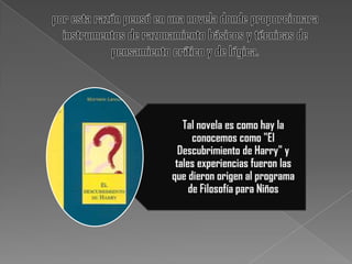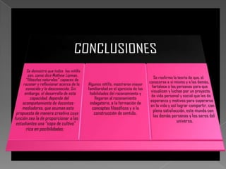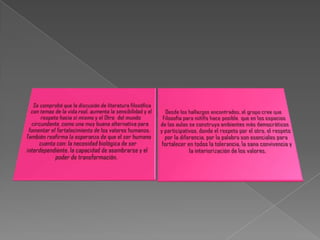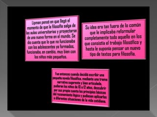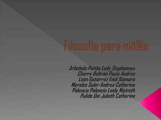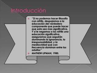 El documento discute la importancia de enseñar filosofía a niños para desarrollar un pensamiento complejo y una educación significativa. Mathew Lipman, en 1980, argumentó que si no enseñamos filosofía a los niños, les negamos una educación significativa y aseguramos que seguirán dominados por la ignorancia y la mediocridad. El documento también describe cómo el programa de "filosofía para niños" en un colegio femenino busca fortalecer competencias comunicativas y democráticas en las estudiantes.