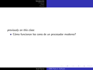 El documento explora los orígenes y fundamentos de UNIX y MATLAB, abordando el funcionamiento de los procesadores y la interacción con ellos a través de diferentes lenguajes de programación. Detalla la importancia de compilar frente a interpretar, así como los principios filosóficos detrás del diseño de UNIX. Se enfatizan elementos clave de la arquitectura UNIX, como el kernel, el sistema de archivos jerárquico, y los procesos que proporcionan servicios del sistema.