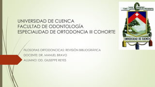 Este documento resume la evolución histórica de la ortodoncia desde el siglo XIX hasta la actualidad. Destaca las contribuciones de pioneros como Delabarre, Angle y Tweed, y describe las principales filosofías ortodóncicas como las de Andrews, Roth y Damon.
