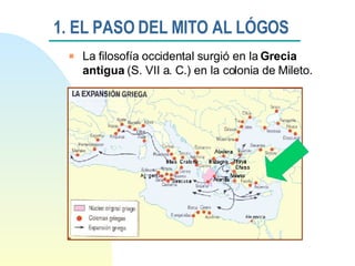 Los primeros filósofos griegos conocidos como presocráticos surgieron en el siglo VII a.C. en Mileto y marcaron el paso del mito al razonamiento filosófico. Los principales presocráticos incluyen a Tales, Anaximandro, Anaxímenes, Pitágoras, Heráclito, Jenófanes, Parménides y Demócrito. Cada uno propuso una teoría diferente sobre el arjé o principio fundamental de la realidad, como el agua, el aire, el número o el átomo. Juntos inici