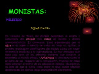 El documento resume las ideas principales de varios filósofos presocráticos. Tales de Mileto argumentó que el agua es el origen de todas las cosas. Anaximandro propuso que el principio de todas las cosas es el aire. Heráclito creía que el fundamento de todo es el cambio incesante y que el principio subyacente es el fuego. Parménides de Elea propuso que el ser es único, homogéneo e inmóvil. Pitágoras enseñó que los números son la esencia de todas las cosas. Empédocles post