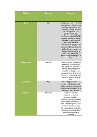 El documento resume las propuestas filosóficas de varios filósofos presocráticos sobre el origen y la naturaleza de la realidad. Tales propuso que todo se originó del agua. Anaximandro propuso que el origen era el apeiron o infinito. Anaxímenes argumentó que el aire era el elemento fundamental. Pitágoras creía que los números explicaban la realidad. Heráclito propuso que el logos daba coherencia al universo. Parménides argumentó que lo real era el ser. Empédocles propuso