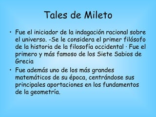 Este documento presenta resúmenes breves de varios filósofos griegos antiguos importantes como Tales de Mileto, Anaximandro de Mileto, Pitágoras de Samos y Heráclito de Éfeso. Describe sus principales ideas filosóficas y contribuciones, como la teoría de Tales de que el agua es la sustancia fundamental de la naturaleza, la noción de Anaximandro del ápeiron como principio indefinido de todas las cosas, y las ideas matemáticas y metafísicas de Pitágoras y Heráclito