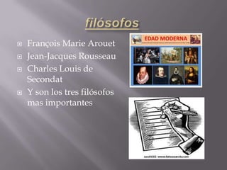 Este documento resume la información sobre tres importantes filósofos de la Ilustración: Voltaire, Rousseau y Montesquieu. Voltaire enfatizó el poder de la razón humana, Rousseau fue un escritor y filósofo franco-helvético, y Montesquieu fue un pensador político francés. Los filósofos protestaban contra los reyes con sus ideas para defender al pueblo.
