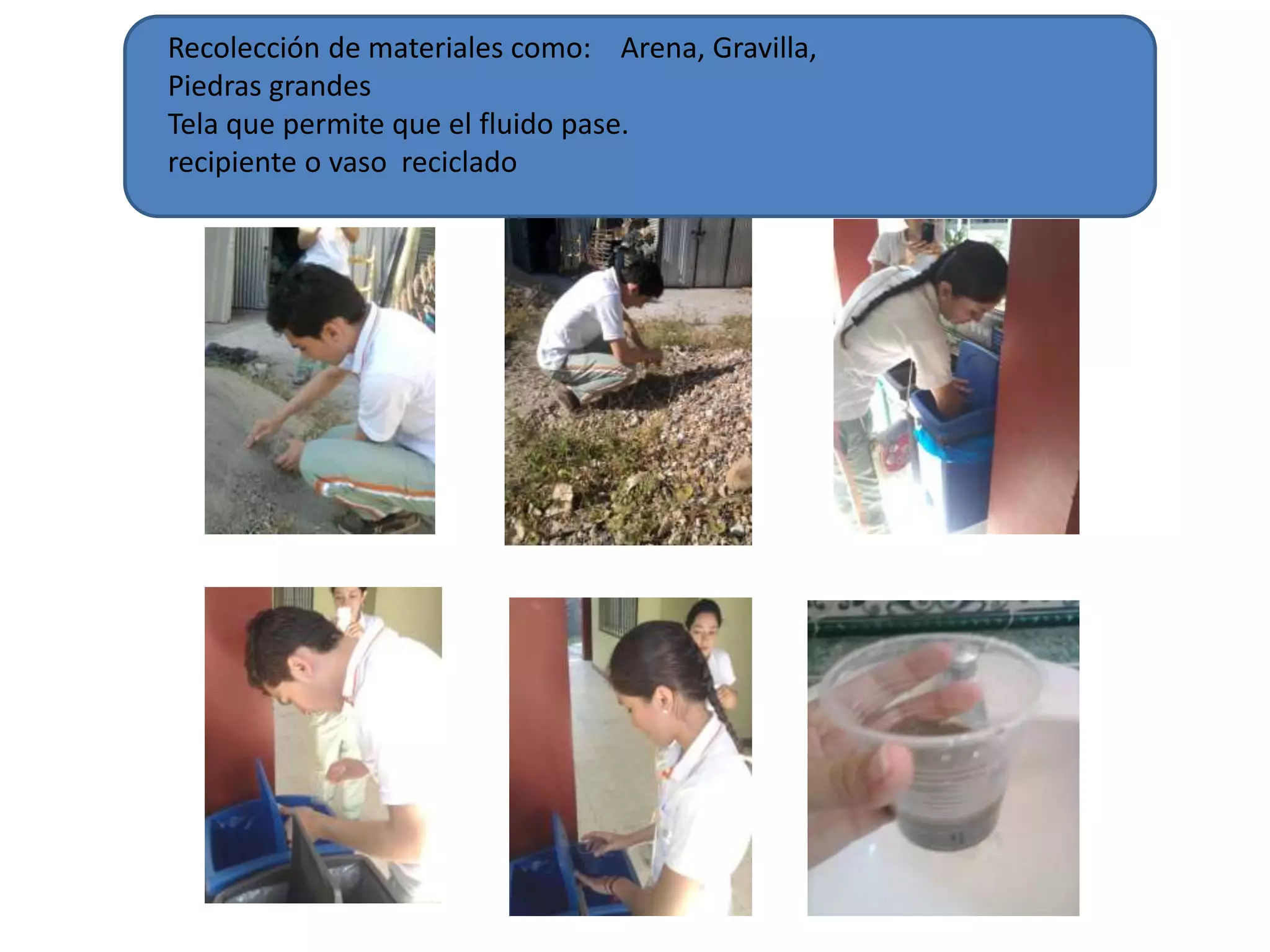 El documento describe cómo construir un filtro casero utilizando materiales reciclados como arena, gravilla, piedras grandes y tela colocados en capas dentro de un recipiente. Primero se limpian y ordenan los materiales, luego la tela en la parte inferior, seguida de capas de arena, gravilla y piedras grandes en la parte superior para filtrar el agua a través del recipiente.