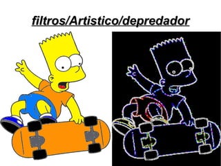 Este documento lista diferentes tipos de filtros que se pueden aplicar a imágenes, incluyendo filtros artísticos como cubismo y entelar, filtros de detección de bordes, filtros que añaden ruido, niebla o efectos de iluminación, y filtros decorativos como diapositivas.