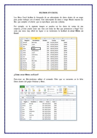 Este documento describe cómo usar filtros y formato condicional en Excel. Explica que los filtros permiten mostrar solo un subconjunto de datos que cumplen ciertos criterios, como filtrar por nombre o región. Describe cómo crear filtros manualmente o al convertir los datos en una tabla. También cubre cómo quitar filtros, y filtros avanzados que permiten criterios lógicos. El formato condicional permite dar formato a celdas dependiendo de si cumplen ciertas condiciones, como colorear celdas mayores a $5,000.