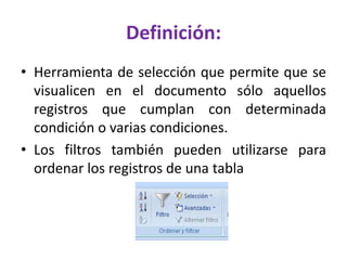 Este documento describe diferentes tipos de filtros que permiten visualizar solo los registros de una tabla que cumplen con ciertas condiciones. Explica filtros por selección para mostrar registros con un dato en común, filtros excluyentes para excluir registros con un dato específico, filtros por formulario que permiten múltiples condiciones, y filtros de orden avanzado para aplicar varios criterios.