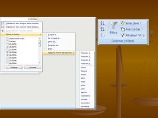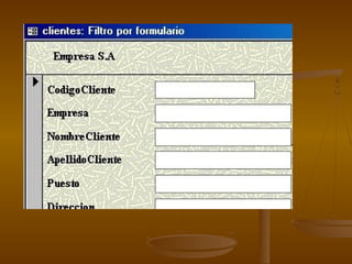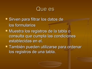 Los filtros sirven para filtrar los datos de los formularios y mostrar solo los registros que cumplan con ciertas condiciones. Pueden usarse para filtrar datos por formulario, seleccionando campos específicos, o mediante filtros avanzados que permiten expresiones similares a fórmulas y criterios de consulta.