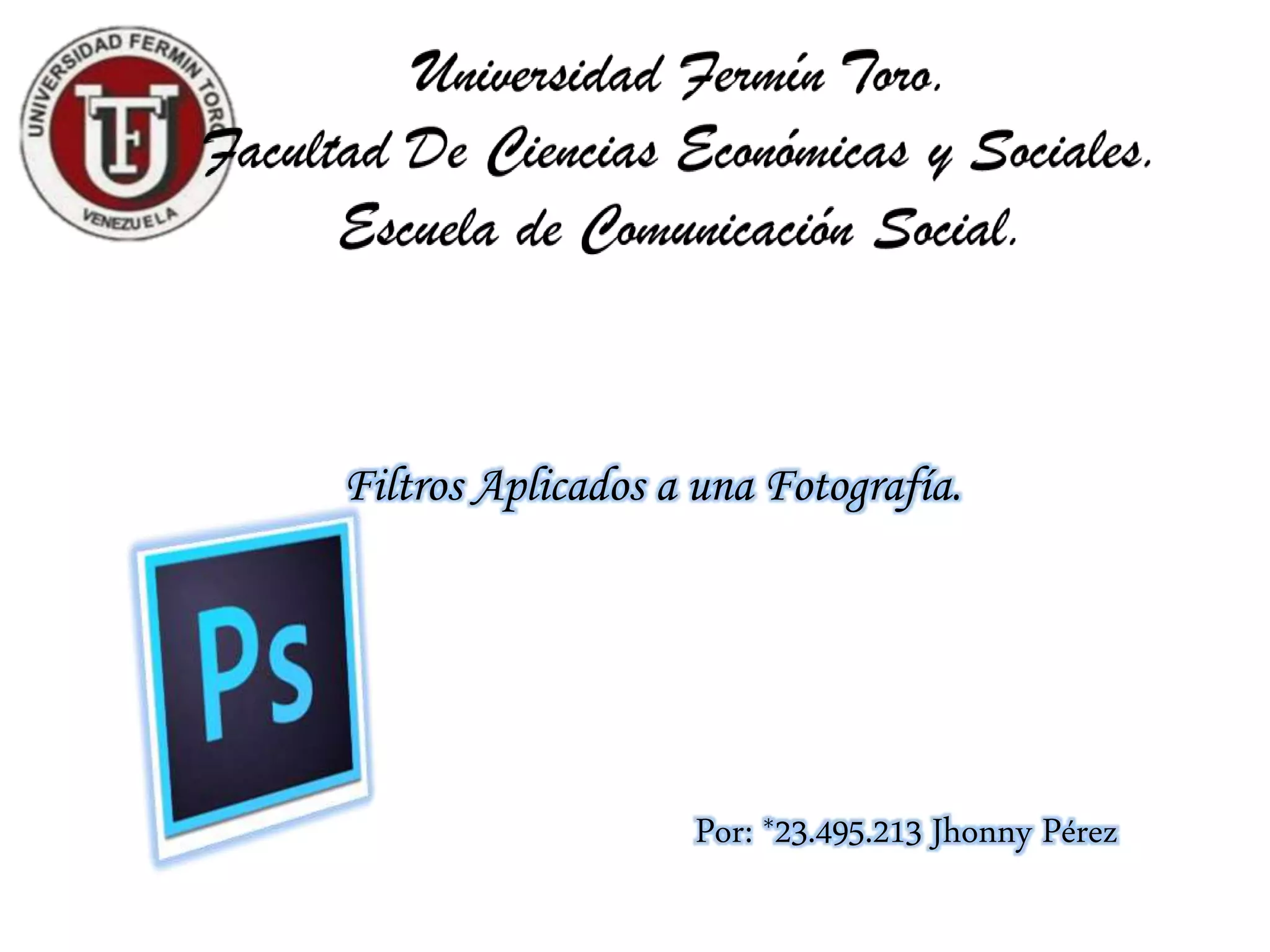 El documento describe 10 filtros aplicados a una fotografía para distorsionarla o darle un estilo diferente. El primer filtro aplicó un estilo oleoso para distorsionar la imagen sin perder su contexto. Los filtros subsiguientes aplicaron efectos como destellos, granulado, carboncillo, película granulada y bordes resplandecientes para transformar progresivamente la imagen de una actual a una más antigua o de estilo vintage. Los últimos filtros dividieron la imagen en mosaicos o vidrios para emular ese estilo, y uno final desenfoc
