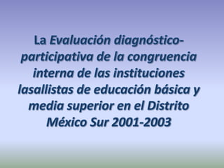 El documento presenta un proceso de investigación evaluativa en centros educativos lasallistas del Distrito México Sur, utilizando metodologías cualitativas para mejorar la calidad educativa. Se analizan cuatro unidades de análisis relacionadas con la identidad institucional, la convivencia, el proyecto psicopedagógico y la formación personal, involucrando a actores educativos en un enfoque participativo. Los resultados permiten a las instituciones comprender su funcionamiento y proponer soluciones adaptadas a sus necesidades, estableciendo así una cultura de evaluación enfocada en la mejora educativa.