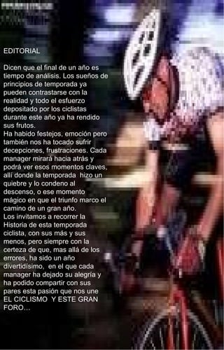 El documento resume los aspectos más destacados de la temporada ciclista, incluyendo las posiciones finales en el ranking UCI WorldTour, con Saxo Bank en primer lugar, y los ascensos y descensos de categoría de los equipos continentales, siendo Europcar y Amore & Vita los que ascendieron a Profesional Continental.